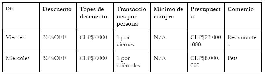 Promoción válida hasta la fecha y hora indicada, o hasta agotar presupuesto promocional de CLP $23.000.000 (veintitrés millones de pesos) en el caso de Restaurantes y CLP$8.000.000 en el caso de Pets (ocho millones de pesos) lo que primero ocurra.