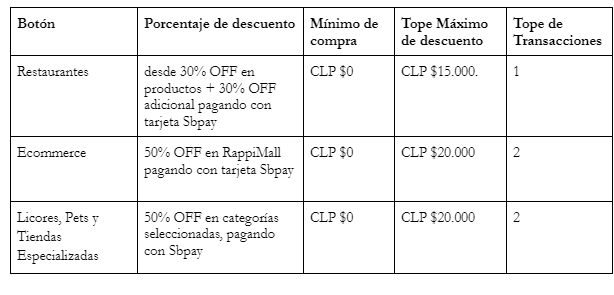 La presente promoción otorgará a los usuarios/consumidores, variados porcentajes de descuento para compras realizadas durante el evento “Cyber Day” pagando con tarjeta Sbpay en Botones y Tiendas seleccionadas al interior de la Plataforma de contacto Rappi, específicamente en las que se detallan a continuación: